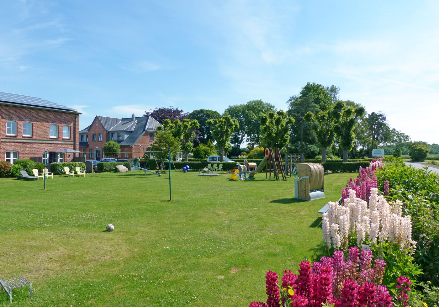 Großer Spielplatz mit verschiedenen Spielgeräten, sichere Grünflächen und viel Platz zum Toben für Kinder jeden Alters.